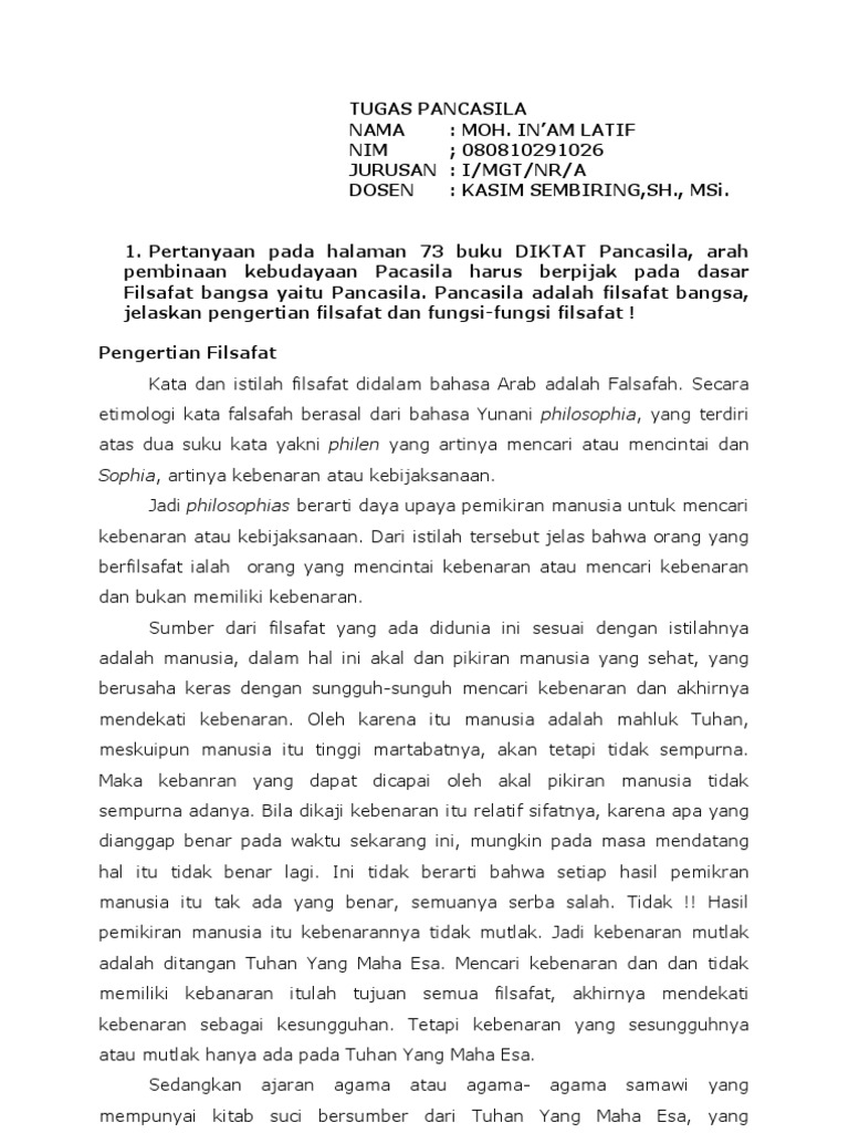 Pancasila Sebagai Sistem Filsafat Pengertian Hakekat Dan Ciri Menurut wikipedia Filsafat adalah studi tentang seluruh fenomena kehidupan dan pemikiran manusia secara kritis dan dijabarkan dalam konsep mendasar. Hal itu di karenakan dengan di canangkannya pendidikan kewarganegaraan di perguruan tinggi diharapkan dapat membentuk mahasiswa menjadi manusia yang intelektual memiliki rasa kebangsaancinta tanah airmenghargai jasa para pahlawan yang telah tumpah untuk. Jawablah pertanyaan-pertanyaan berikut ini dengan jelas.